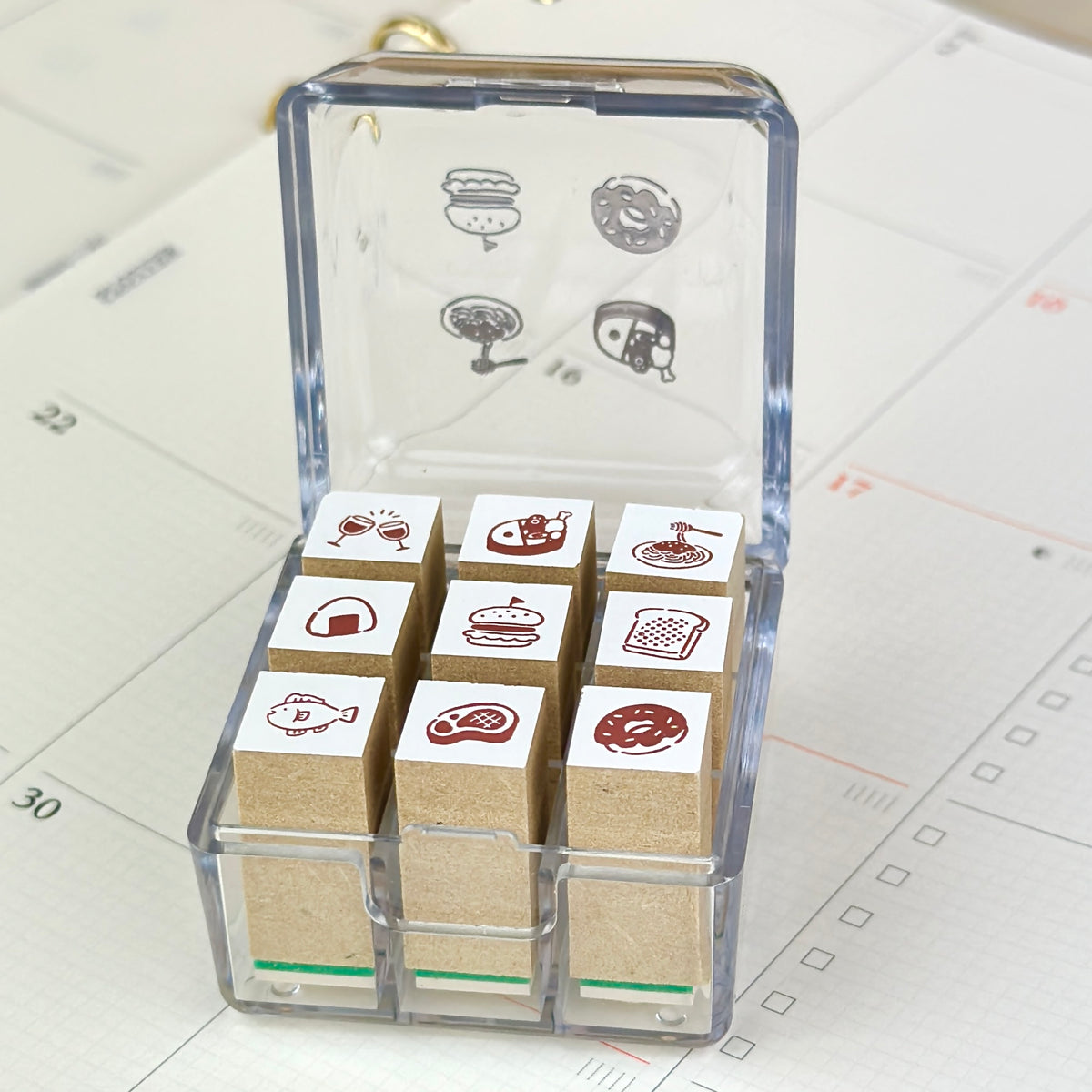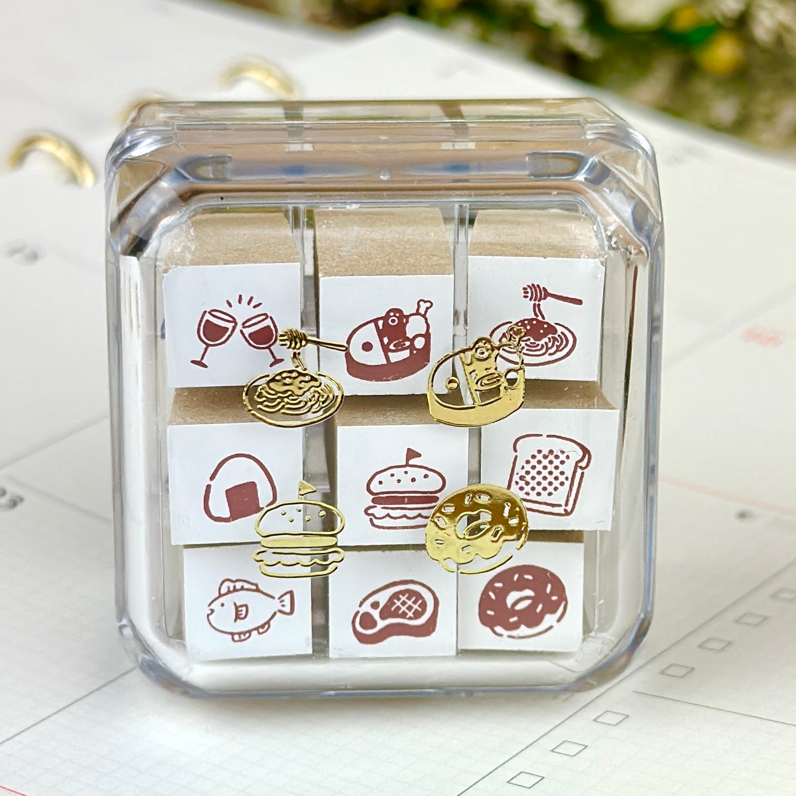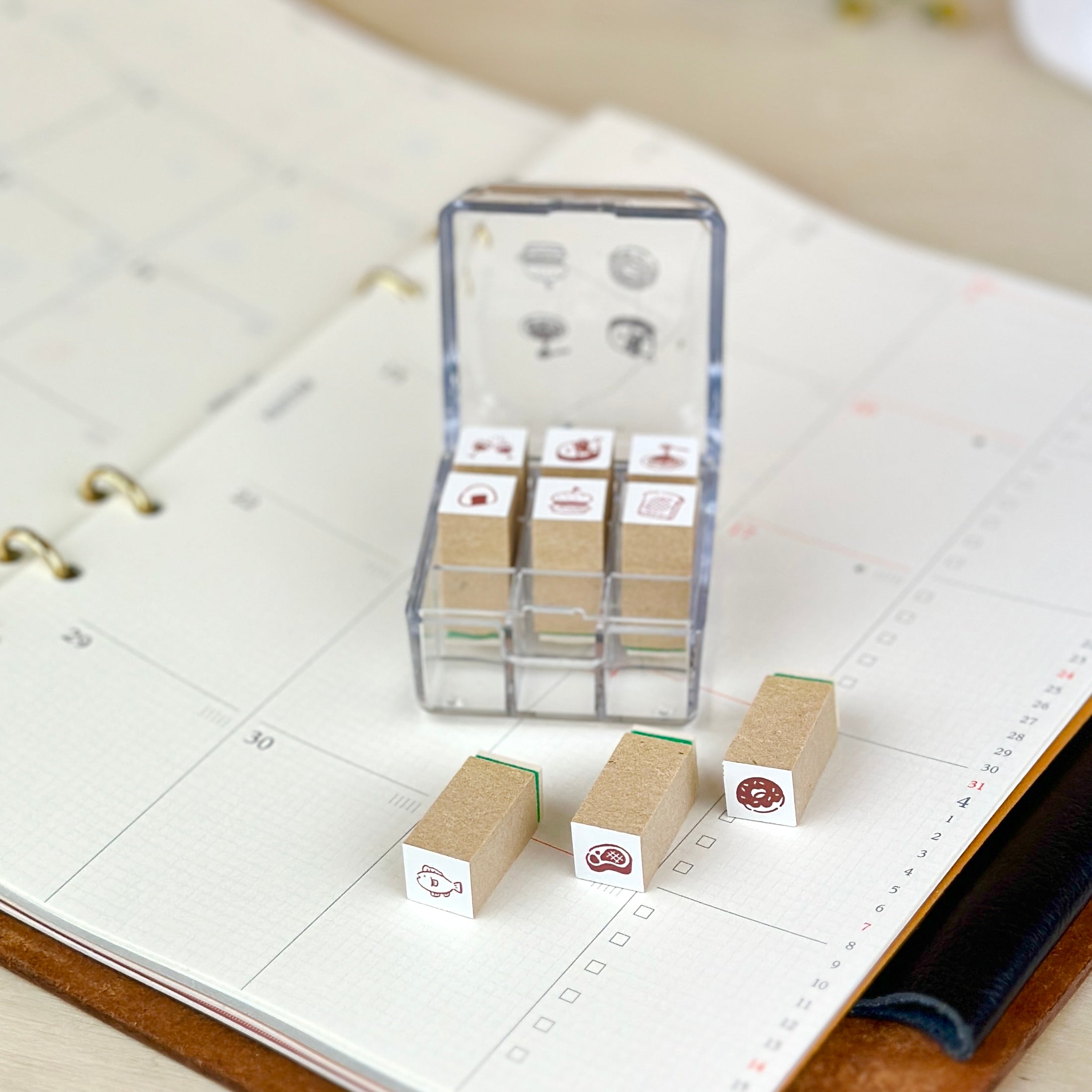 For a cute focal point in your calendar, or decoration for your notebook these thematic rubber stamps are a must have! This set features delicious food items like onigiri, bento boxes, spaghetti, wine, steak, bread, donuts, and fish.