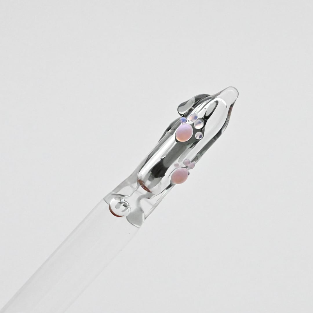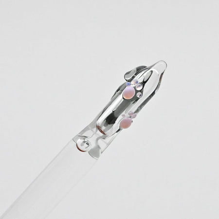 The Lavie Cat & Goldfish series tells a simple tale of a cat admiring a goldfish. This pen body features a hollow liquid filled chamber which a glass goldfish swims through as you write. Enjoy the soft tapping sounds and feeling as the fish meanders from one end of the pond to the other. At the end of the pen their is a lounging cat. The backside of the pen features paw prints in a soft pink iridescent glass.