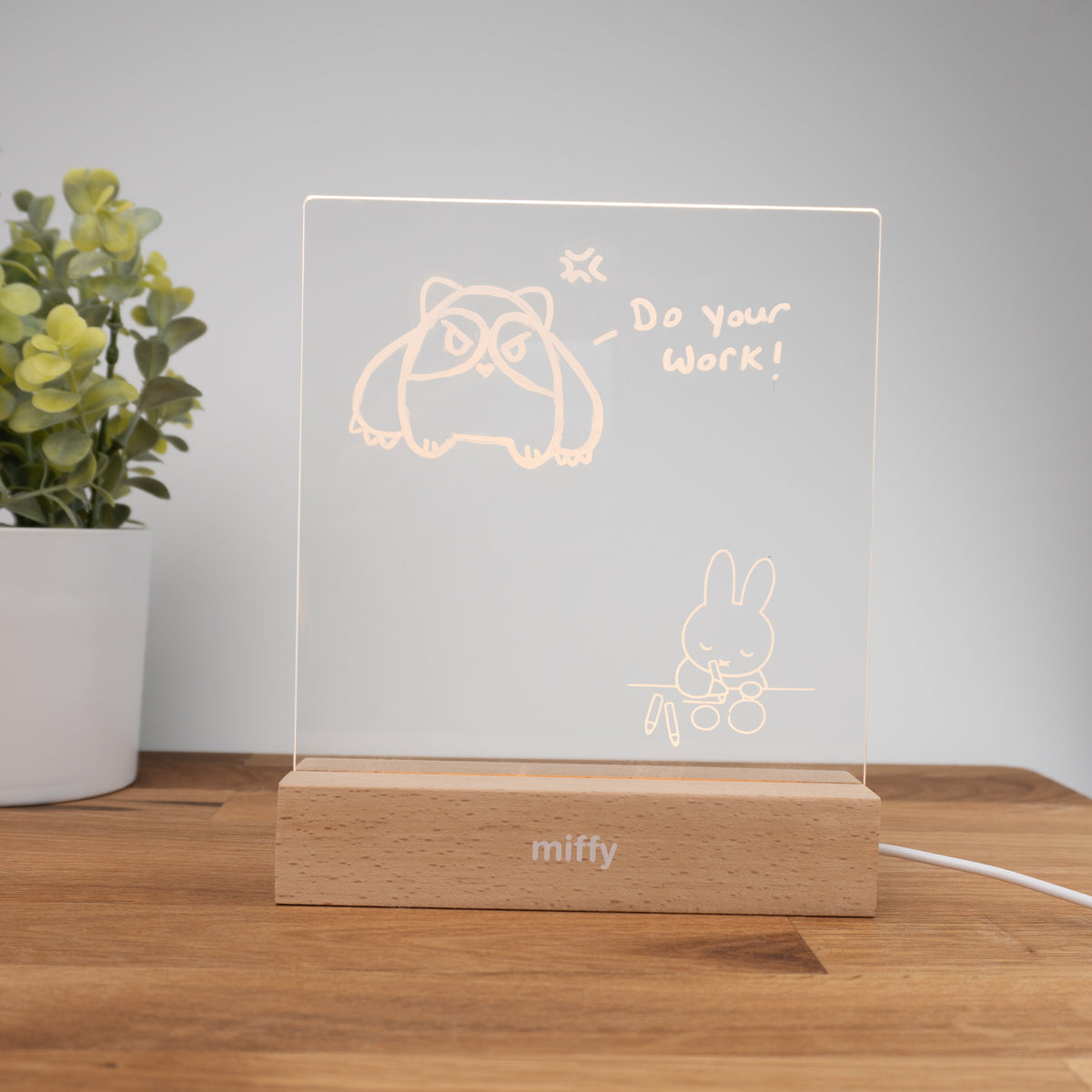 Add aesthetic mood lighting to your space with this adorable Miffy Light Up Writing Board. Write or draw on your board with the included white marker and it will glow when turned on. Perfect for reminder lists, motivational messages or cute doodles. The cord has a button to turn the LED light on and off.