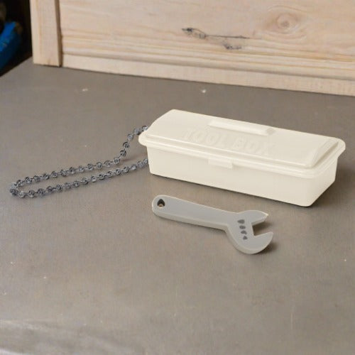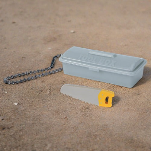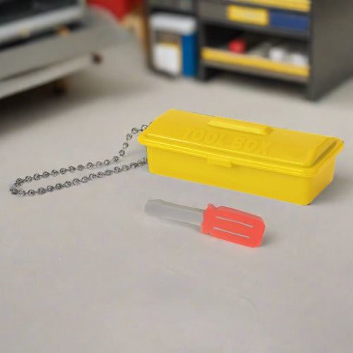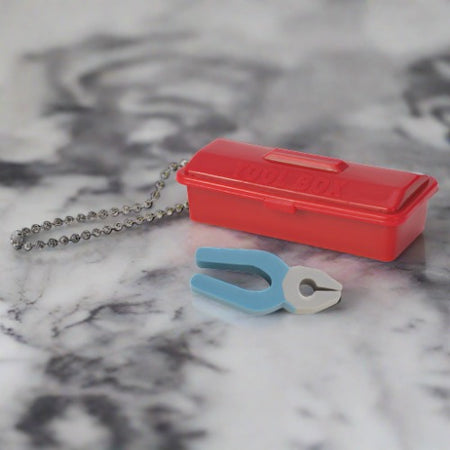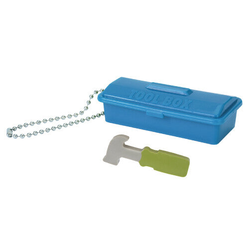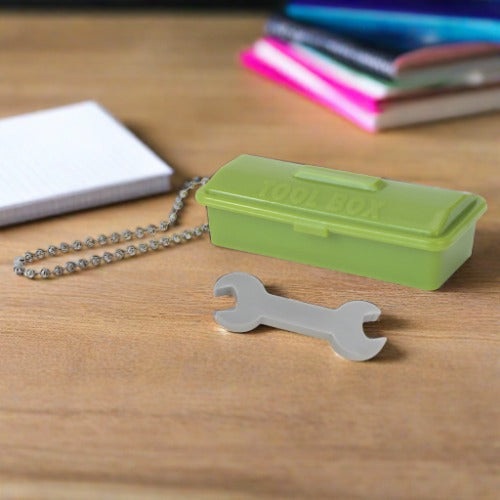 This quirky and unique Tool Box Eraser Keychain. This charming keychain boasts a delightful plastic toolbox design that opens and closes, revealing a mini functional eraser within. With an array of six distinctive designs to choose from, you can showcase your hardworking personality while keeping your keys or lanyard happy.
