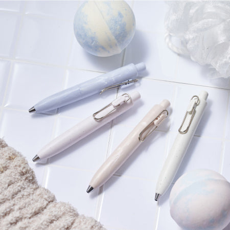 The Uni-ball One P Gel Pen is designed to fit your hand even more comfortably than a normal pen. It is shorter and more plump than a normal pen. In April 2024, they released 4 new colors based on the mellow color and intricate pattern of bath bombs! Marble Savon Blue, Marble Peony, Dot Lavender, and Dot White Tea. These pens take a standard Uniball One refill, which can be purchased in basic colors.