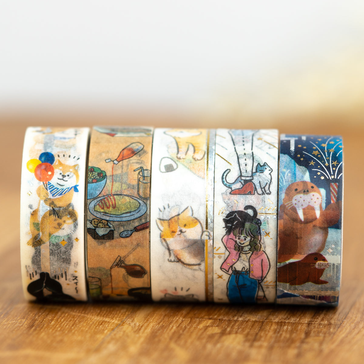 World Craft Kirakira Tatemasu Vertical Foil Washi Tape - Fireworks at Midnight with Arctic Animals (15mm)
